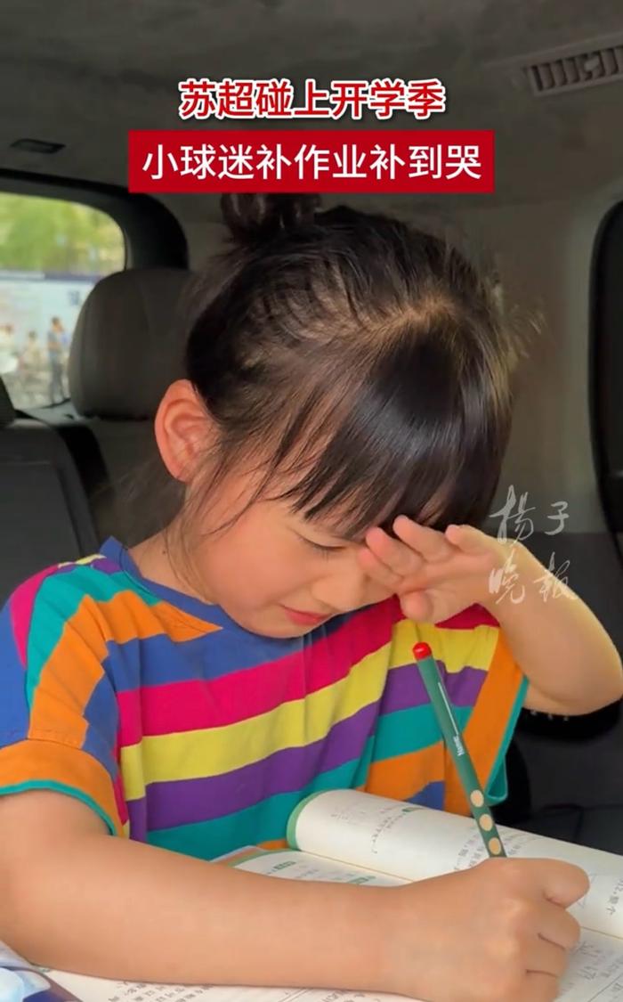 #苏超场外小孩姐车里狂补作业##小孩儿姐暑假作业只有体育做完了# 苏超碰上开学季,小球迷补作业补到哭[哈哈]