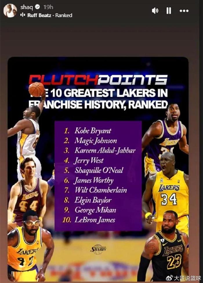 老詹压线入选!奥尼尔评湖人队史10大巨星:科比力压魔术师排第一