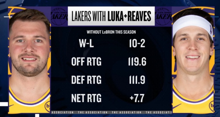 本赛季詹姆斯缺席而东契奇、里夫斯出战时,湖人10胜2负